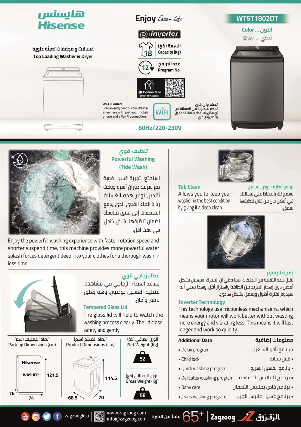 غسالة هايسنس (18) كيلو، (12) برنامج ، انفرتر ، واي فاي