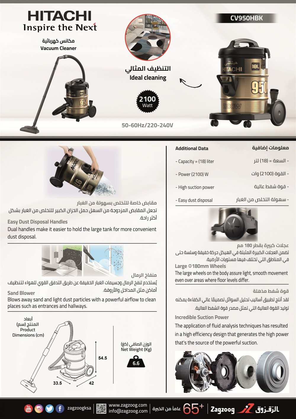 مكنسة هيتاشي برميل، (2100) واط، السعة (18) لتر ، 60/50 هرتز