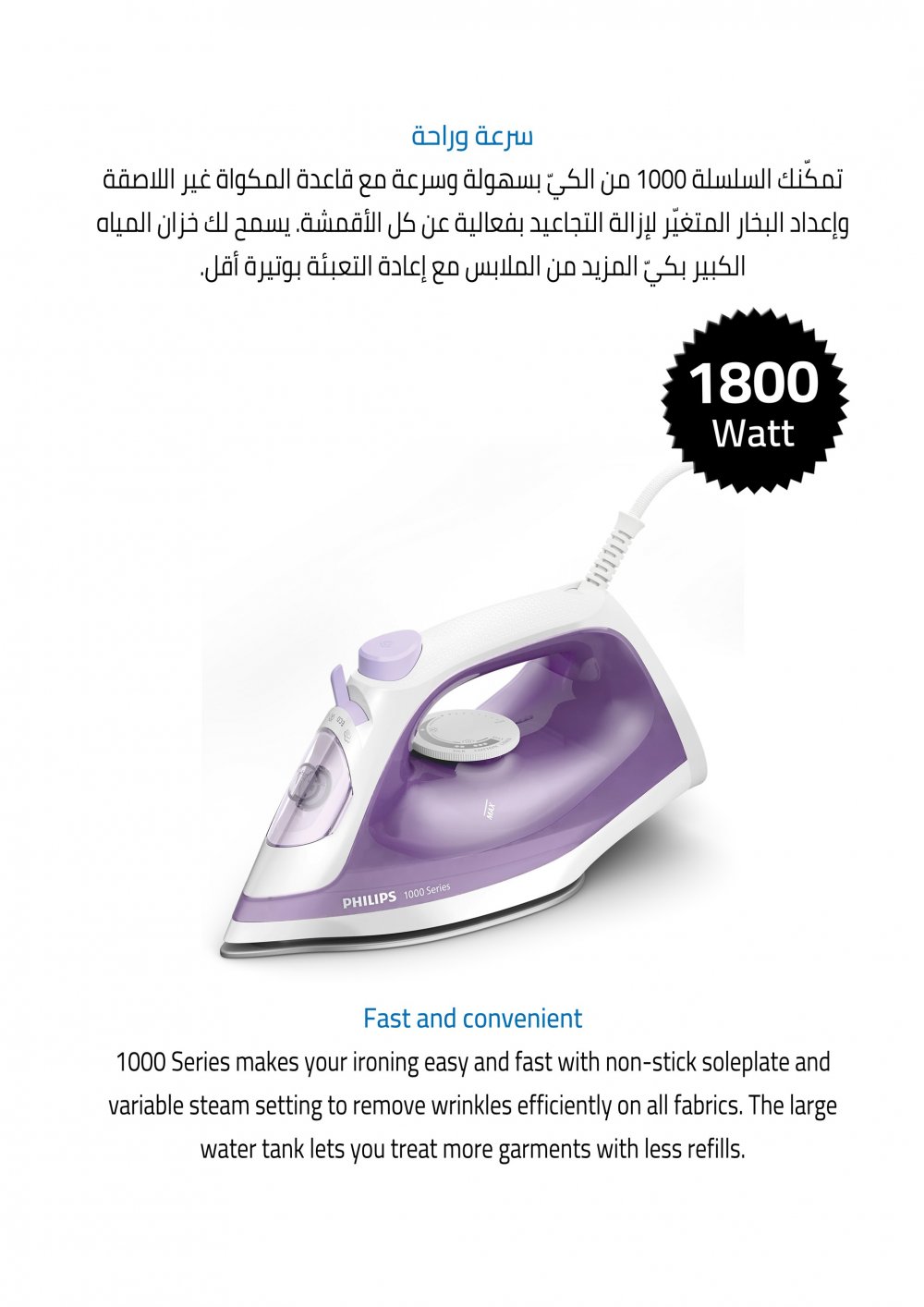 مكواة ملابس فيليبس بدون بخار، (1000) واط، القاعدة من الألمنيوم