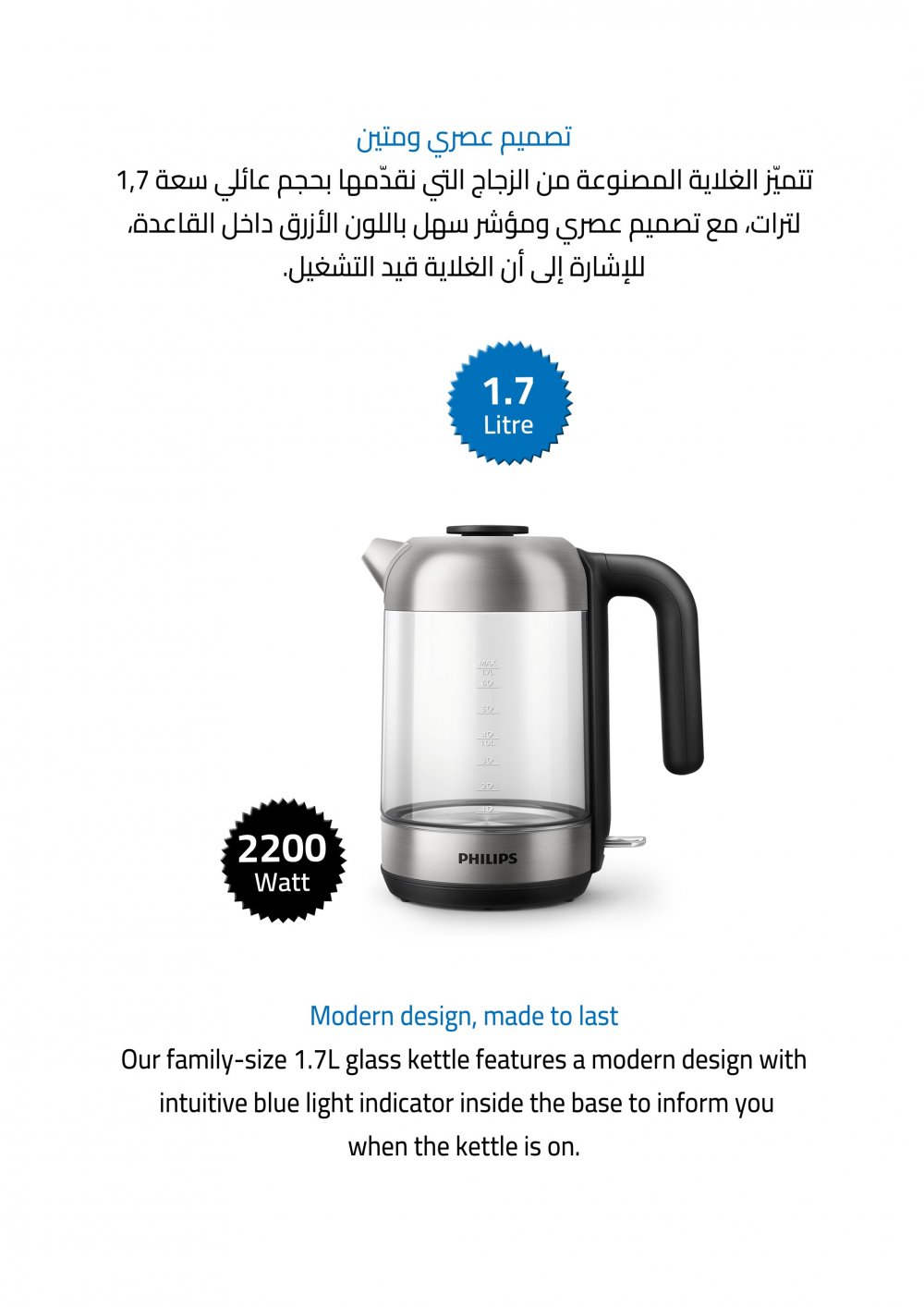 غلاية فيليبس، (2200) واط، بسعة (1.7) لتر