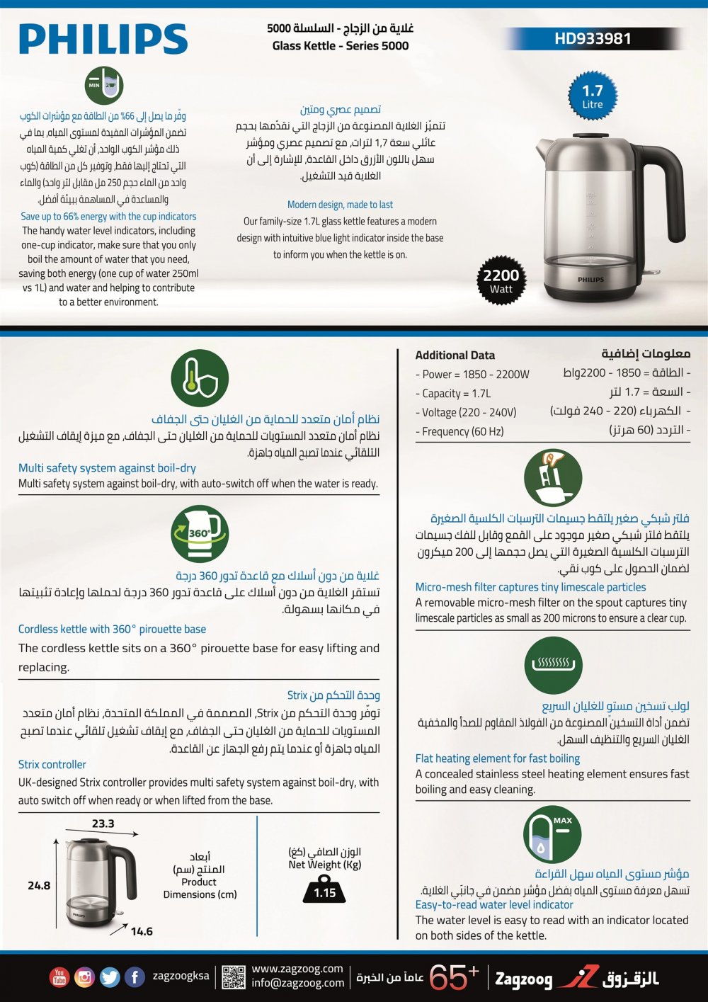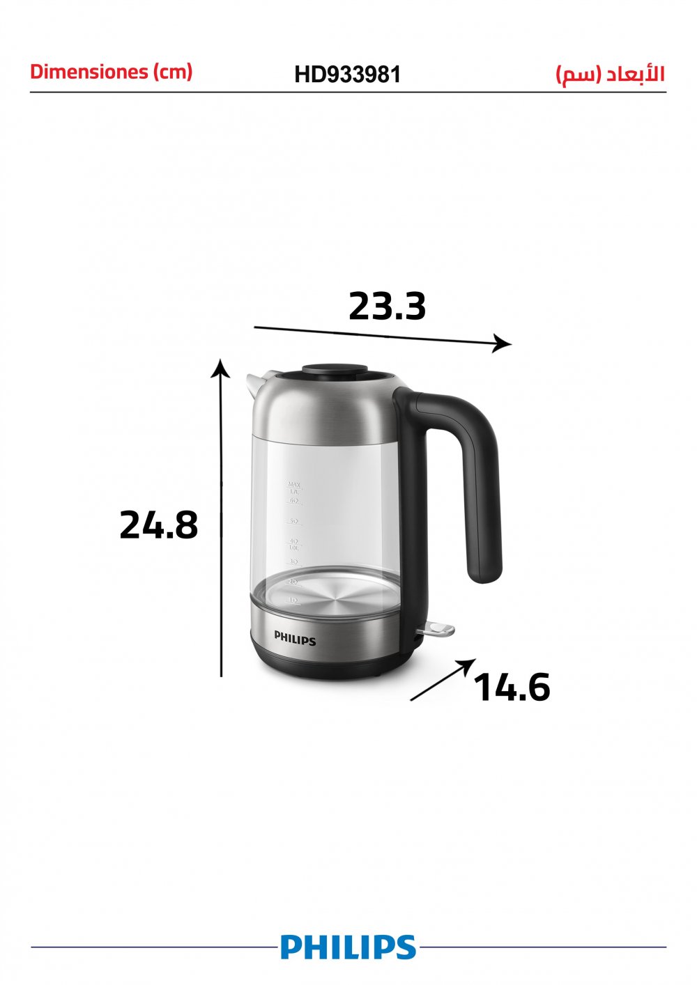 غلاية فيليبس، (2200) واط، بسعة (1.7) لتر ، زجاجية