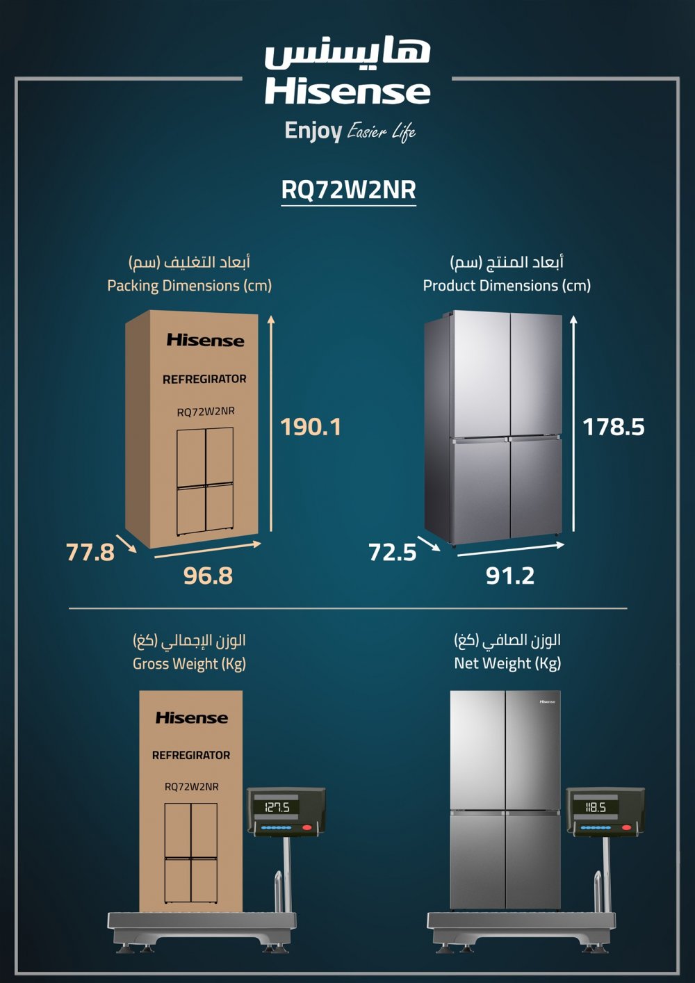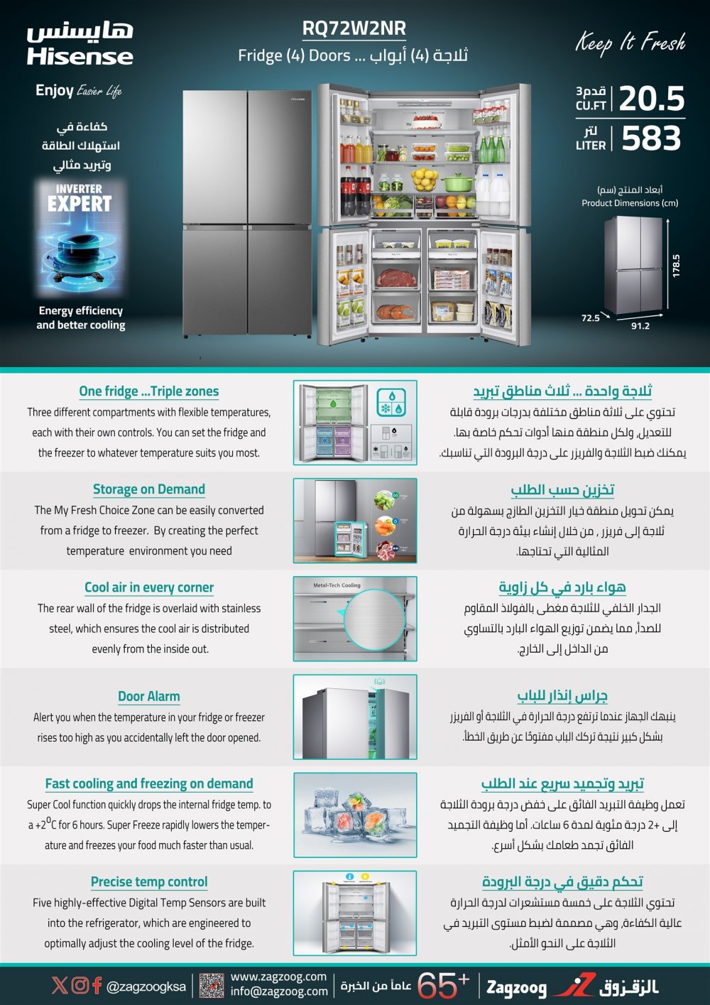 ثلاجة هايسنس (4) أبواب ، (20.5) قدم3 ، (583) لتر ، انفرتر