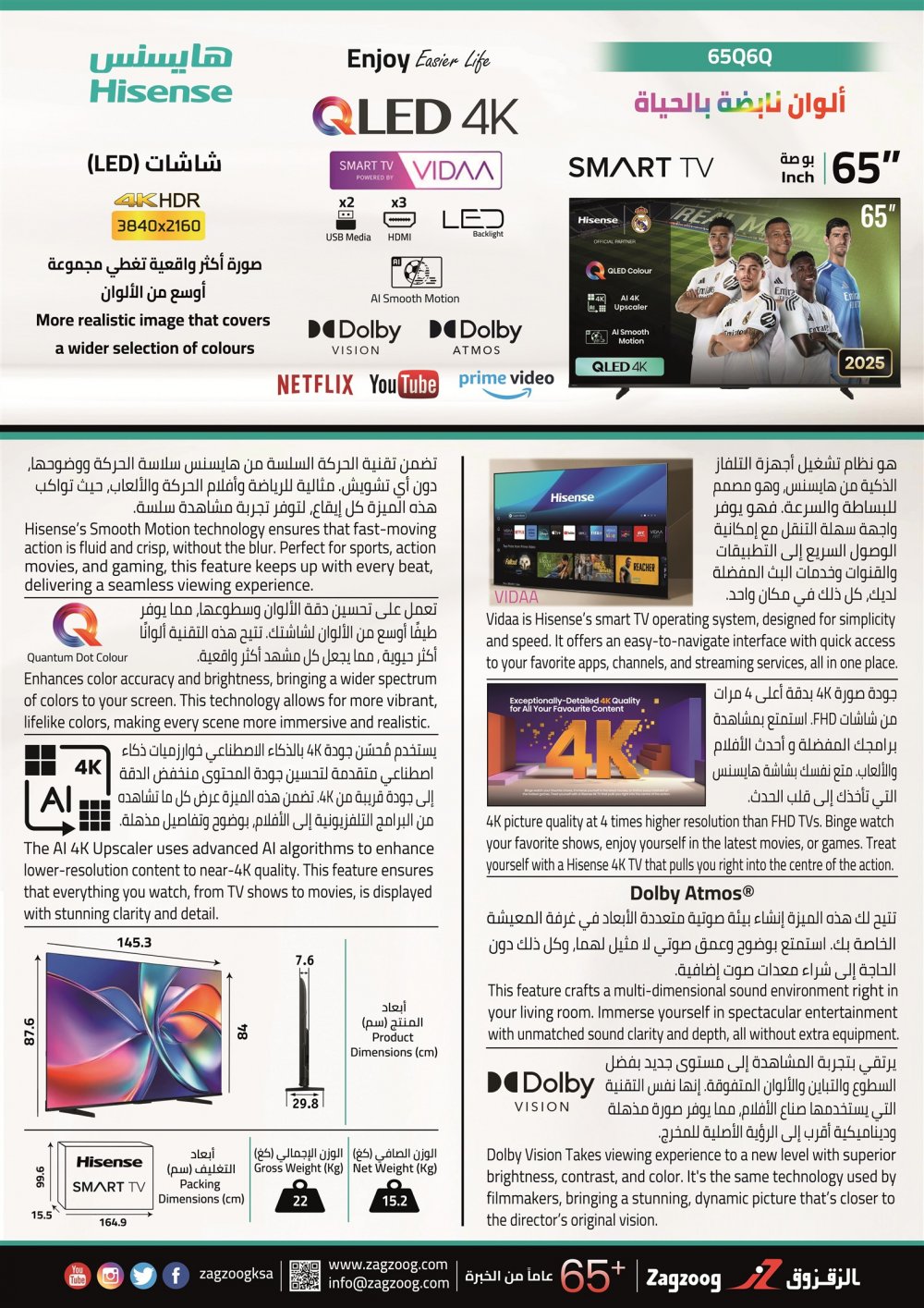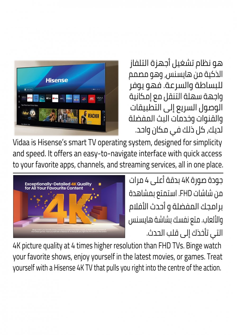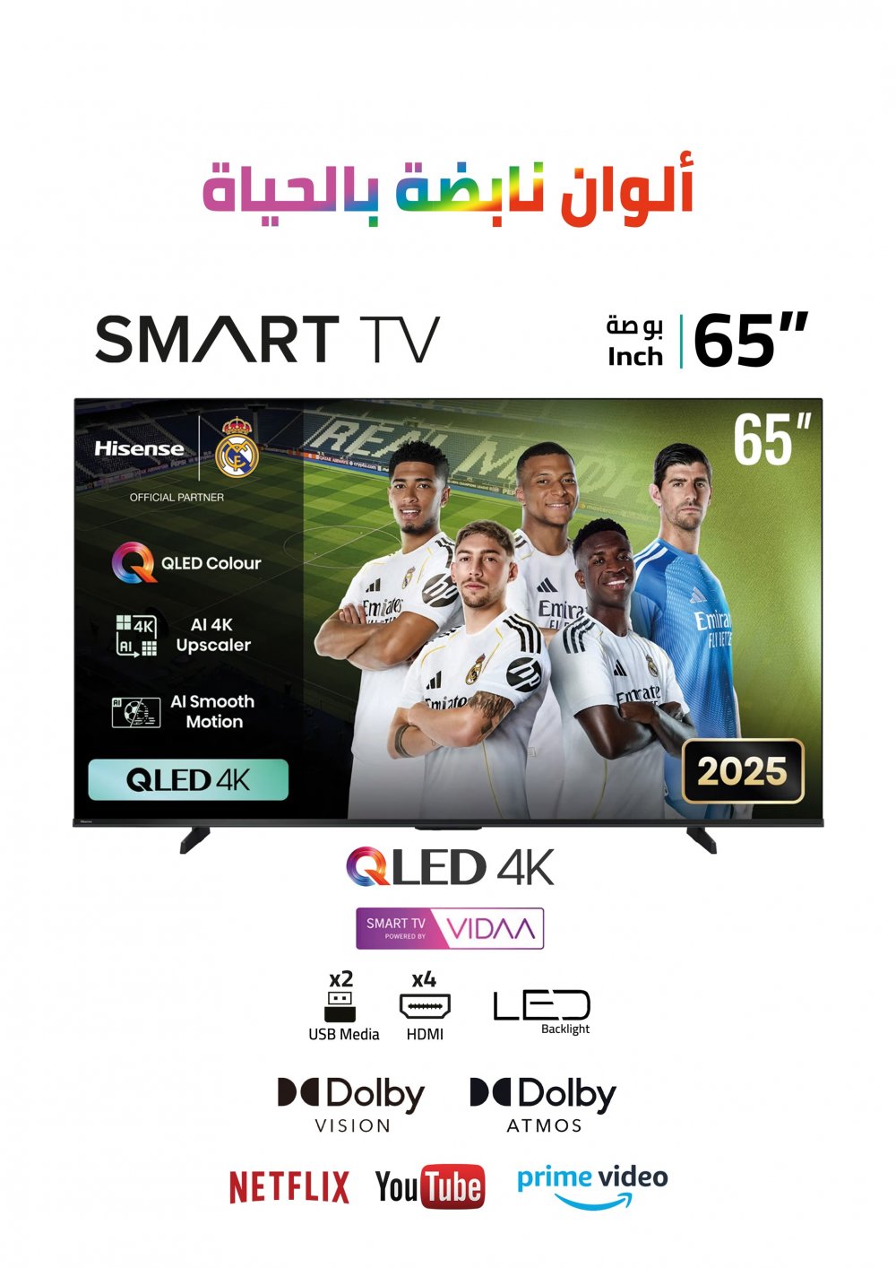 تلفزيون هايسنس 65 بوصة، ذكي، HDR ، 4K ، نظام التشغيل VIDAA