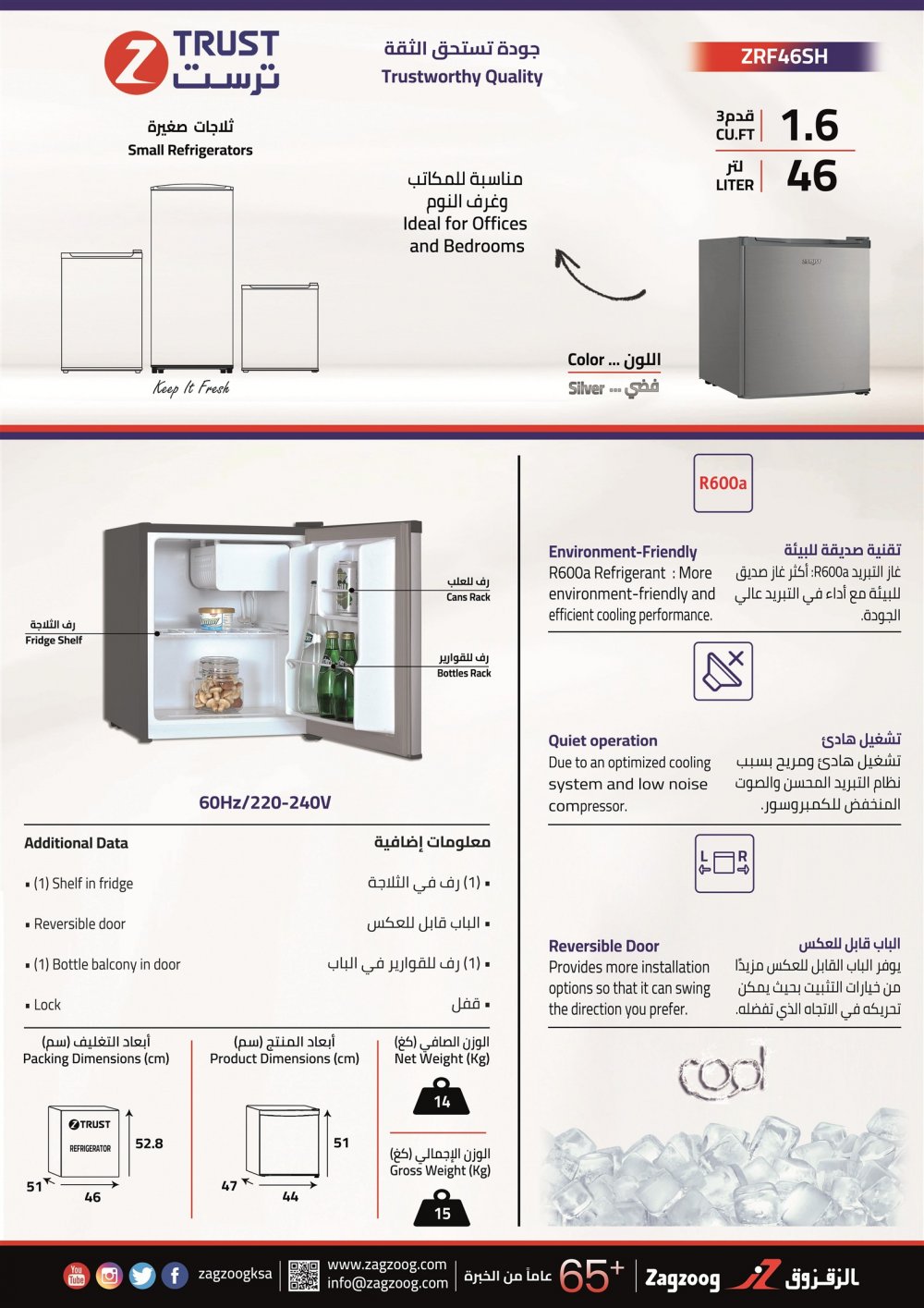 ثلاجة ز.ترست باب واحد (1.6) قدم3 ، (46) لتر