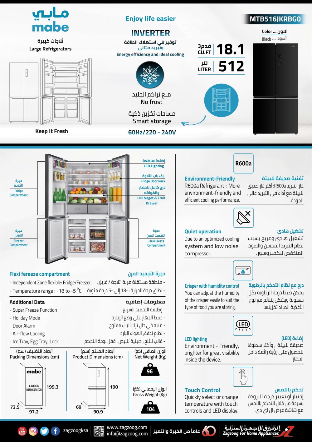 Fridge (4) Door , (18.1) CF, (512) L , Inverter